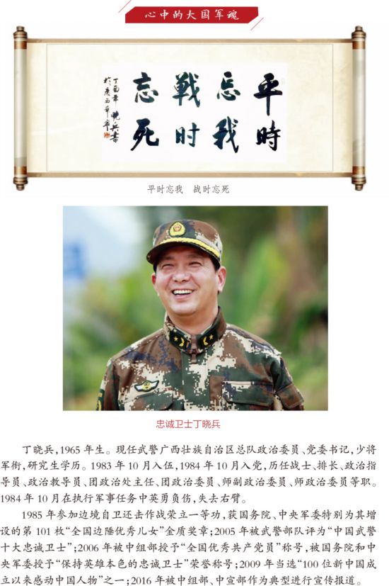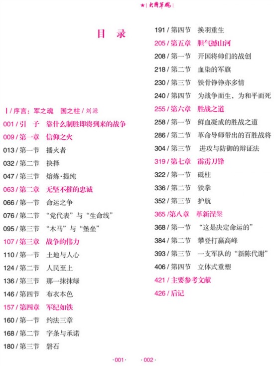 劉源在序言中動情地寫道:“這種精神特質,是革命理想高于天的堅定信仰,是對黨絕對忠誠的政治自覺,是深扎于人民的力量根基,是步調一致得勝利的嚴明紀律,是不怕苦不怕死的血性膽魄,是機動靈活的戰略戰術,是勇立時代潮頭的革新銳氣,是為國為民勇于亮劍的使命擔當。這些精神上的獨特優勢,構成我軍戰斗力的關鍵要素, 成為激勵中華民族自強不息、拼搏進取的強大精神滋養。特別是在那些永載史冊的重大歷史轉折關頭,在那些備受矚目的重大歷史考驗面前,中國軍人所展現的特有的精氣神,挺起了中華民族的脊梁,成為國家精神的閃亮名片。”