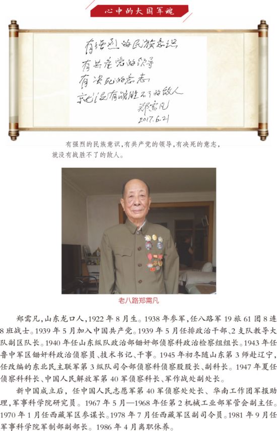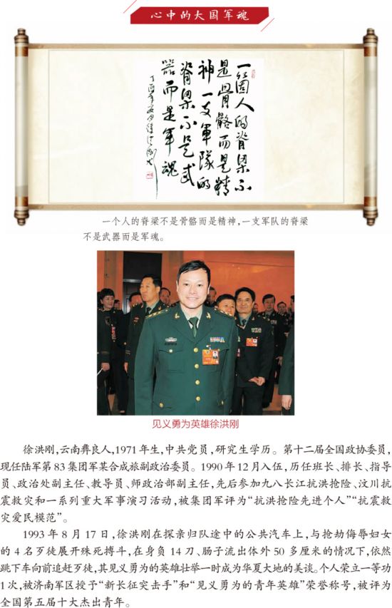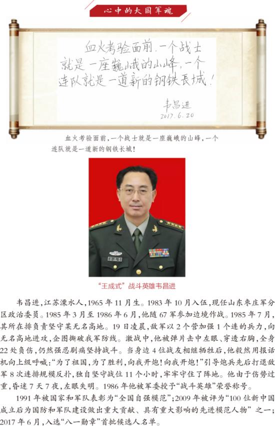 革命需要熱血頭顱,戰爭造就英雄豪杰。我們深切感受到,人民軍隊是一支涌現無數高尚勇士的革命隊伍。這支軍隊的精神特質,既凝結著東方的、民族的、黨性的豐富內涵,又濃縮了一代代優秀軍人的精神群像,可以說是由那些最忠勇最堅定、藐視苦難和死亡、極富血性鋒芒的英雄們的精神品格匯聚而成。他們璀璨的人生歷史和精神氣度,不僅屬于他們的個體生命與家道傳承,同時也是人民軍隊乃至整個社會歷史的輝煌篇章,是大國復興最需要激蕩的民族精魂。