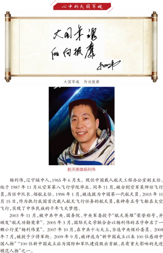 《大國軍魂》一書由劉源上將作序,軍事名家羅援、徐焰、陳舟聯袂推薦。不同歷史時期的英模代表王成登、楊利偉、丁曉兵、韋昌進、徐洪剛等親筆書寫軍魂感悟,讓讀者“觸摸到滾燙的軍魂”。