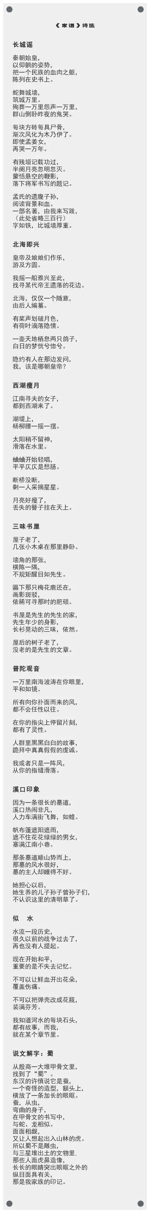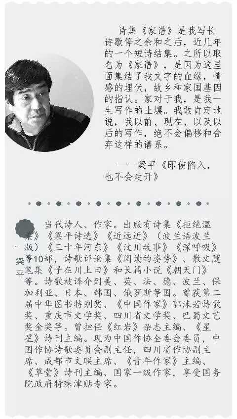 《家譜》中,收錄了梁平近年來150余首詩歌,全書分為“為漢字而生”“蜀的胎記”“巴的血型”三個部分,“大部分是關(guān)于成都、重慶的詩歌,也有一些其他城市、景點的作品,有一種家國情懷。”梁平說,之所以取名為《家譜》,是因為這里面集結(jié)了自己文字的血緣,情感的埋伏,故鄉(xiāng)和家國基因的指認。“家對于我,是我一生寫作的土壤。我敢肯定地說,我以前、現(xiàn)在、以及以后的寫作,絕不會偏移和舍棄這樣的譜系?!?br />