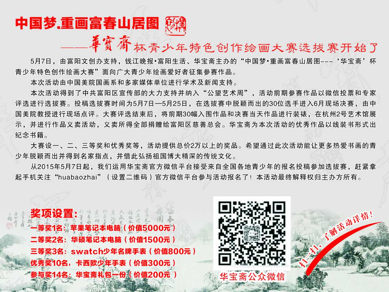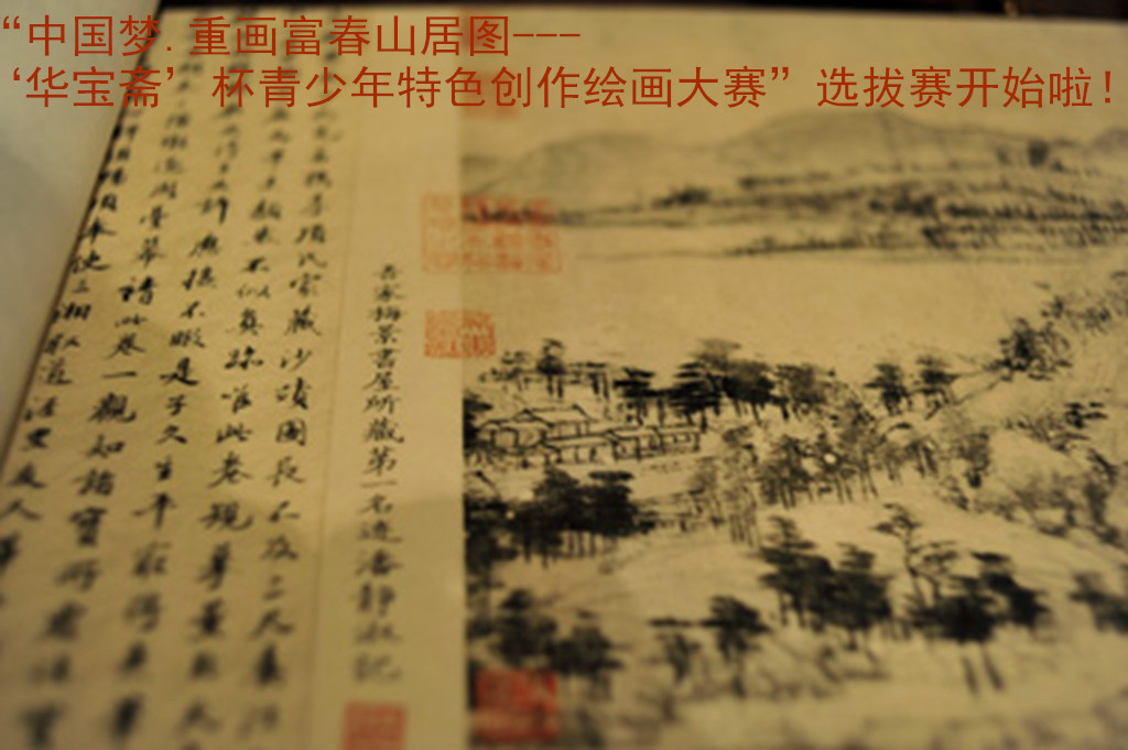 由華寶齋、錢江晚報.富陽生活主辦,中國美院國畫系學術支持,中國國際廣播電臺國際在線書畫頻道、浙江日報、浙江在線、錢江晚報、杭州日報、每日商報、杭州在線、富陽在線、富陽論壇、作家網、《藝術名家》、《卓克藝術網》等媒體單位新聞支持的第一屆“中國夢.重畫富春山居圖——‘華寶齋’杯青少年特色創作繪畫大賽”應運而生。