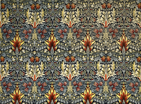 不過,莫里斯的方式十分獨特,他很少以人物畫來闡述自己的觀點,也很少以風景畫來表明自己的態度。他采取的方式是以不計其數的壁紙圖案來表現。在其早期,他選擇植物的蜿蜒形態,如菊花、石榴,以及其他各種各樣的花卉圖案,到后來,他又將興趣轉移到織品設計之上,圖案也從植物變成動植物的隨心交匯。這些功不可沒的先河之效,為莫里斯贏得“現代設計先驅者”的稱譽。但由此出現的問題是,僅僅以這些壁紙或者布料上的圖案設計,就能證明他對世界有認知?