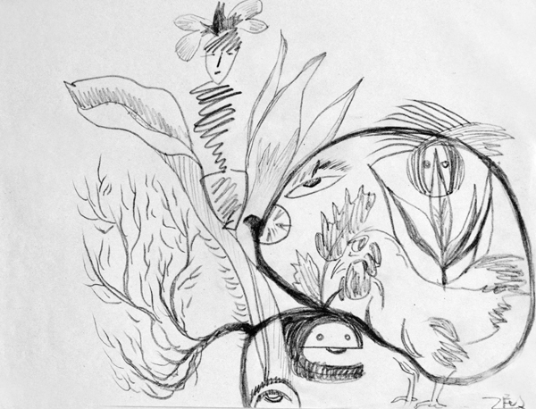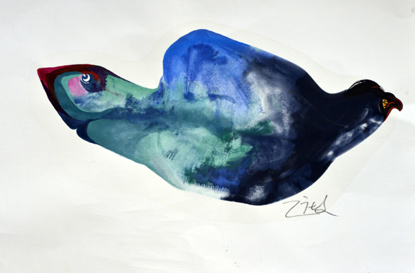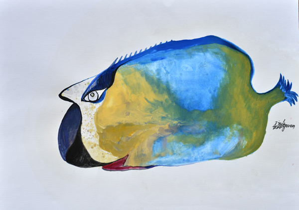 后來又在微信看到莊文陸續發布他畫的魚,心里閃過,難道莊文也趕詩人繪畫的時髦,開始拿起畫筆不成?但看多了又覺得莊文不像我等外行,只會涂鴉,他的畫是有功底的。意大利學者翁貝托.艾柯有言“繪畫就是把線條和顏色放到它應該在的地方”,這句話說出了專業畫家和非專業畫家的區別,為什么非專業畫家的“畫”看起來那么別扭,那是他們把線條和顏色放在“不應該在”的地方。以莊文的魚為例,每一條都在形狀上處于魚的位置,莊文好像對馬甲魚比較寵愛,他的魚大部分都是這類,南方的餐桌上經??梢婑R甲魚,刺大、肉多,吃起來舒服不用擔心被扎到。我不知道生活中莊文是不是喜歡吃這種魚,如果喜歡的話,又怎么好意思畫它?如果不喜歡,為什么老畫它?這真是讓莊文左右為難的一個問題。下次見了問他。