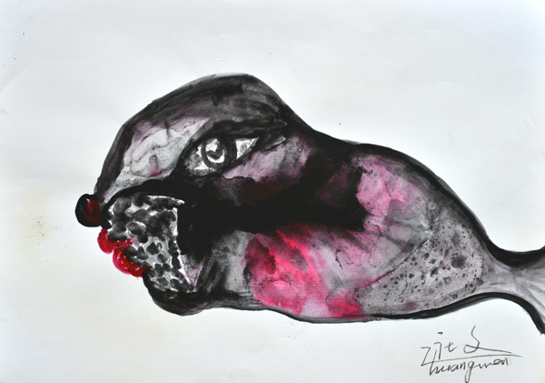 莊文畫魚不符合生活真實的地方還有他對魚的五官的處理。小部分情況下他尊重魚的五官,大部分情況他不尊重魚的五官,而是盡己所愿為魚安上五官,有時一條魚身上還有另一副人的五官,甚至兔子甚至老鼠,也都被他安到魚的身上,這就是超現實了。畫家畢竟不能只顧照搬生活,任何藝術創作都是如此,藝術家總想為生活增加點什么,這“什么”就是藝術家的創造性。恰恰是這一點“創造性”才是一個藝術家貢獻給世界的一個嶄新元素。莊文的京劇臉譜魚、莊文的魚之五官,是莊文區別于其他藝術家的所在。