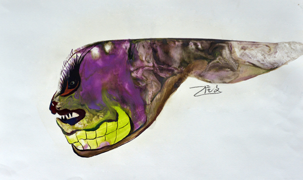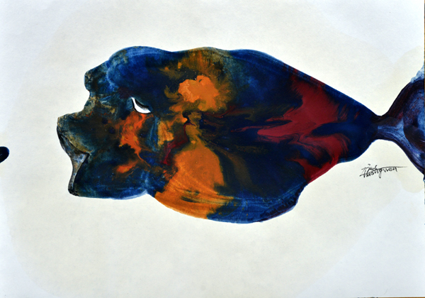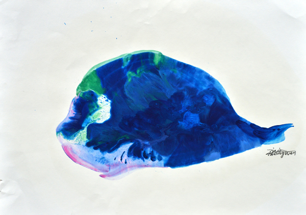 后來看莊文的魚看多了,發現莊文也不僅止于馬甲魚,還有很多長條形的三角形的甚至不規則形的魚,這里面已經有了莊文對魚的觀察與藝術的處理,所謂變形。其實,任何一種動物在運動中或多或少都會發生變形,魚在水中游,速度使它變形,水使它變形,人觀察的角度也使它變形。因此,莊文的魚符合生活的真實。莊文的魚不符合生活真實的地方在我看來是他對色彩的處理,我覺得莊文很大膽,他把孩童的想象力保持到成年,這真不容易。在孩子們看來,世界是五顏六色的,越小的孩子他們的色彩感越絢麗,這從孩子們的繪畫里可以看出。莊文的魚也是如此,我看他的魚,突然就看到中國京劇臉譜,那種混搭中的比例是有講究的,什么地方該亮,什么地方該暗,什么地方該輕輕一抹點綴一下,絲毫不含糊。于是我想,莊文莫非想畫出系列臉譜魚?這個問題也得下次見了問他。