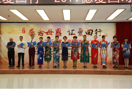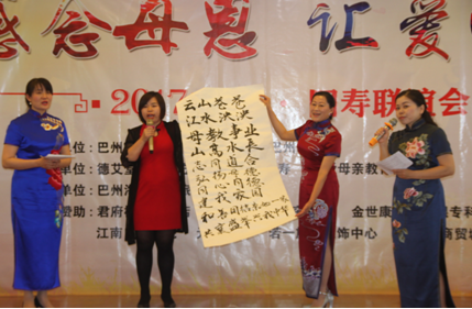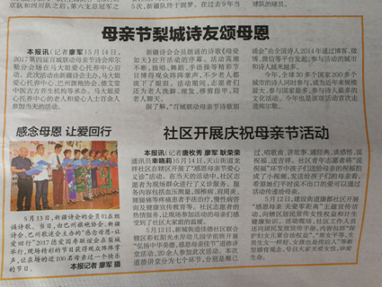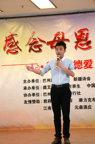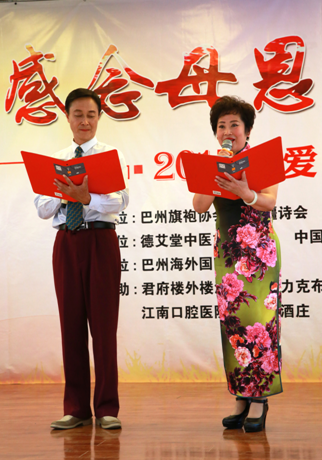 2017年5月13日下午,在國壽大廈巴州分公司十樓會場,由新疆詩會、巴州旗袍協會、巴州歌迷會聯合主辦,在中國人壽巴州分公司、德艾堂古方艾灸中醫養生館、君府樓外樓酒店、庫爾勒金三角商貿城天潤祥珠寶、新疆阿不旦餐飲文化管理有限公司、摩力克布藝窗簾專賣、巴州海外國際旅行社、金世康眼耳鼻喉專科醫院、江南口腔醫院、姝雅女子學堂、心悅瑜伽會所、若一旗袍服飾中心等的大力支持下,“用動人的歌聲,歌頌母德;用贊美的詩詞,感念母恩;用女人的風采,母儀天下”為主題內容的聯誼會,圓滿舉辦,為母親節“第四屆全球百城聯動——給媽媽的詩”的朗誦會,起到了很好的預熱效果。現場精彩紛呈的節目,充滿驚喜的禮物,讓到場的百余位母親應接不暇,深深地為身為人母而倍感自豪,在感受到了做母親偉大的同時,也明確了做母親的責任!
