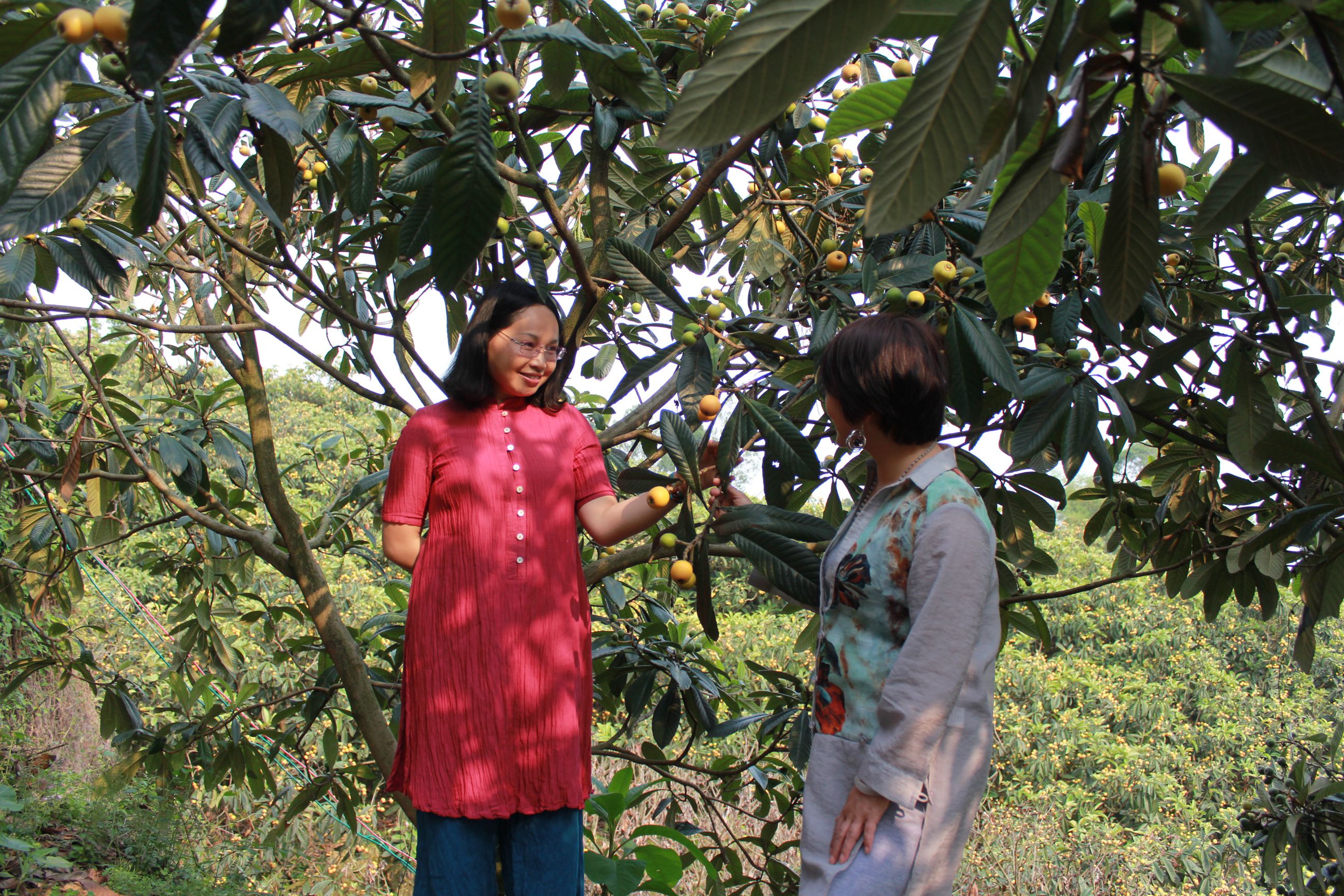 武眉凌與永善縣委常委、宣傳部長劉洪蕓在枇杷樹下交談