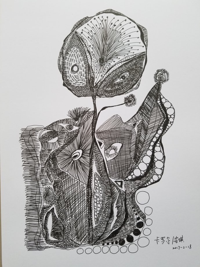 今年2月,安琪又開啟另一項工程:鋼筆畫。我驚嘆她畫作之余,不久就變成擔心。在她轉發趙麗華老師微信的時候,我看到她因為不停畫畫,而使得手指形成嚴重腫塊。而照片上的她舉著腫脹手指卻是微笑著面對鏡頭,那心里一定是自足的,就像她面對著一望無際的油菜花,一句一句找到了詩句的自足。這樣積勞的手指恐怕很多人都有過,但擁有這樣手指的時候,大多數都是在讀小學、中學時。總之是青春年少時候,因為我們需要在春光大好的年齡用勤奮來獲取更多知識和積累。而安琪老師早不是那個時候了,她是事業有成的中年,已經用才華和勤奮走上了自己人生的高度,但是她沒有俯視,還在攀登的途中。
