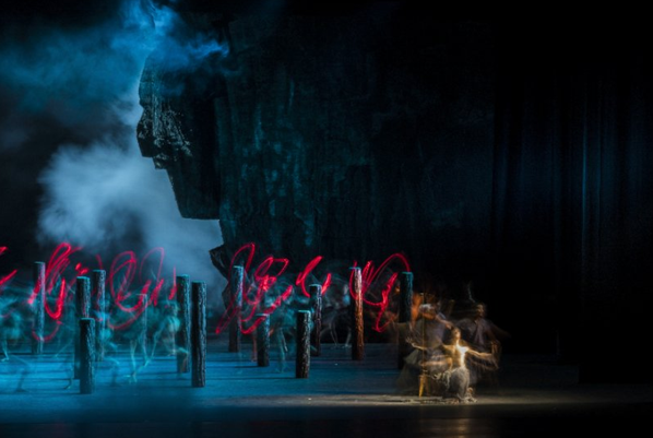 舞劇《大禹》的舞美采用表現主義手法,周立新老師的舞美新穎別致而富有創造性。受舞臺條件限制,舞臺上不直接表現水,但是呈現在觀眾面前的確是相像于水的感受,看起來很舒服,舞美節奏與劇目內容高度統一,令人過目難忘。