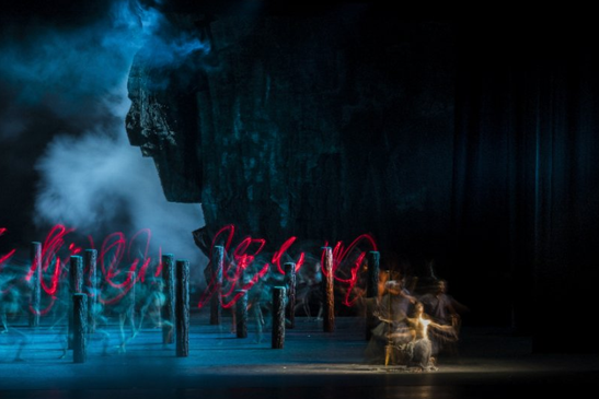 優勢在于這個人物是被民眾所熟知的,挑戰在于要在滿足大眾認知的基礎上,具體細化和創作出新的故事情節,新的細節和幻化還要有其合情、合理性并要被觀眾接受和認可,難度不小。大禹題材由于受舞臺的屬性和劇場演出的局限性等因素影響,舞美設計很難在舞臺上表現水與火等自然災害這些表意呈現。而舞劇《大禹》中最為重要的就是恰恰就是表現大禹和洪水的關系,大禹要與天地洪水這些自然現象去拼爭,所以焦點幾乎全部落在了演員身上。