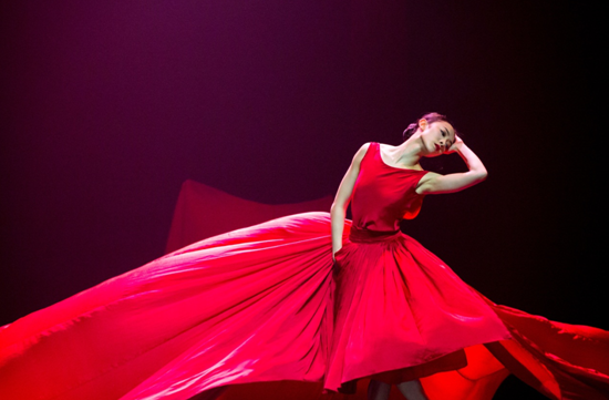 《獨自起舞》這一篇章是荷蘭舞蹈劇院(NDT)資深舞者,富有活力的自新銳編導婁夢涵的作品。在這一篇章中,先由三位男舞者以群舞形式亮相,節奏輕快爽利,與前兩幕的音樂風格形成鮮明對比。伴隨著華宵一的出現,從天而降一條長達3米有余的鮮紅長裙,華宵一穿上紅裙,并進行了一段有如紅浪滔天般的驚艷表演。而在華宵一離開舞臺后,三位男舞者更是讓一張巨幅帷帳當空飄舞,好似波光淋漓,又似驚濤駭浪,令人心頭為之震撼。