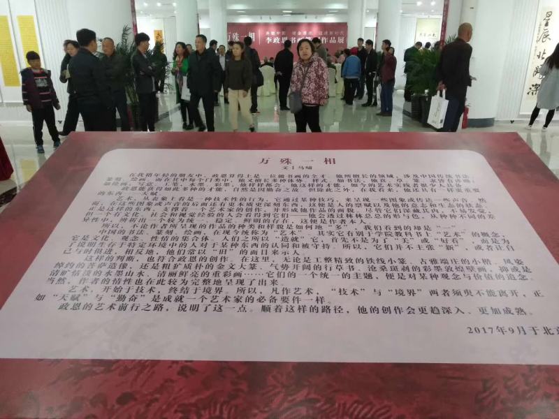 由安徽省淮北市文聯主辦、中國山水畫院等協辦的“萬殊一相·李政恩書畫篆刻作品展”于2017年11月12日在淮北市體育場開幕,共展出青年書畫家李政恩書法、篆刻、山水畫、彩墨敦煌作品130余幅,比較全面的展示出作者創作文脈和各方面的藝術才能。展覽成為淮北市文化藝術界的文化新聞事件,吸引著一批當地收藏家、企業家和書畫藝術愛好者前來觀展,李政恩的二十余名文朋藝友也分別從北京、河北、山東、江蘇、浙江等各地趕來,共襄盛事。