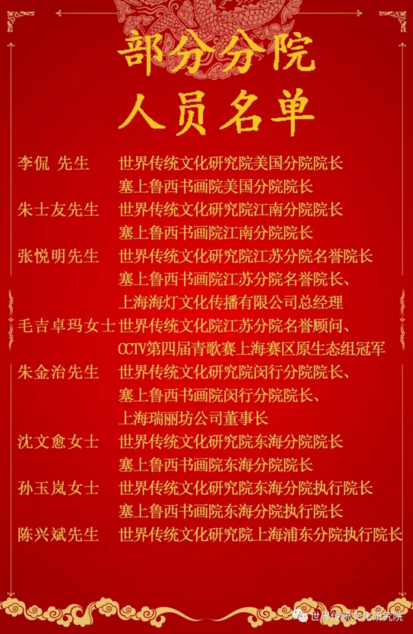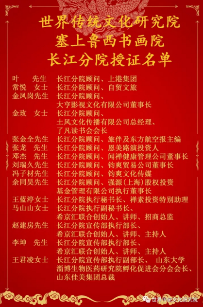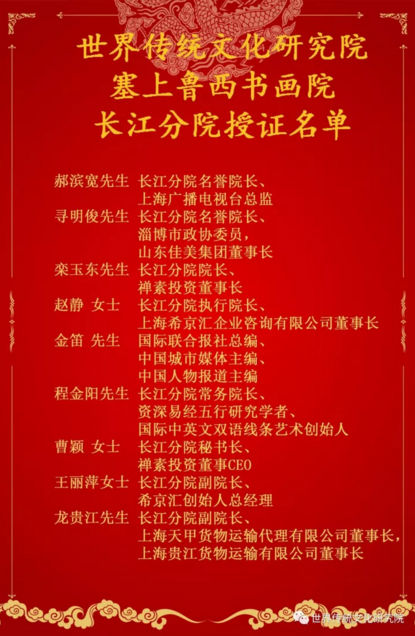 非常榮幸能夠參加世界傳統(tǒng)文化研究院、塞上魯西書畫院長江分院的揭牌儀式,也非常榮幸能夠獲得總院及陳院長的信任有機(jī)會(huì)服務(wù)于總院及長江分院!