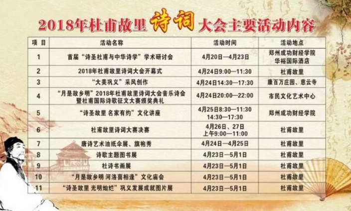 為紀念“詩圣”杜甫,傳承詩歌文明,弘揚民族文化,擴大對外開放,促進文化交流,自2015年起,鞏義市于每年清明節前后,舉辦杜甫國際詩歌節。今年杜甫故里詩詞大會于4月20日啟動,5月1日落幕。詩詞大會期間安排了“詩圣故里桃李芳菲”中小學杜詩朗誦賽、杜甫故里詩詞大賽預賽、 “我和詩圣有個約定”全民誦杜詩線上活動、唐詩藝術油紙傘展、旗袍秀、詩歌主題圖書展、杜詩書畫展、“月是故鄉明、河洛喜相逢”文化廟會、“詩圣故里光明燦爛”鞏義發展成就圖片展首屆“詩圣杜甫與中華詩學”學術研討會、杜甫故里詩詞大會開幕式、“大美鞏義”采風創作、“最是一年春好處”詩歌雅宴、“月是故鄉明”2018年杜甫故里詩詞大會音樂詩會暨杜甫國際詩歌征文大賽頒獎典禮、“詩圣故里 名家有約”文化論壇及專題講座、杜甫故里詩詞大賽決賽等各類活動總計15項。