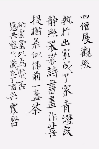 他的感染力,是全方位的。他的閱歷,他的品學(xué)修養(yǎng),他的人格魅力,他的藝術(shù)觀,以及他的第二生命---詩(shī)詞和書(shū)法藝術(shù),構(gòu)成了他立體式的形象。或許,我們可以稱(chēng)他為詩(shī)人,也可以稱(chēng)他為書(shū)法家,還可以稱(chēng)他為殉道者,但是,這都不足以代表他。