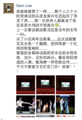 盡管這里那里覺得不足,三個鐘頭里把我神經吊足,情緒回應像全劇一樣流暢緊張,尤其是場息之后劇情進展干脆利落,伴隨李李的痛苦自述,高亢的音樂把我吊到山巔有點吃不消,最后滬生讀信,是姝華的聲音,落到“人生是一次荒涼的旅行”一句,頓覺五內震動,井蛙驚雷,舞臺揭蓋,通天透亮。落幕中掌聲不歇,音樂升起。“花花世界,鴛鴦蝴蝶,在人間已是癲,何苦要上青天,不如溫柔同眠”,在溫馨回蕩中漸次撫平心靈的風暴之旅。
