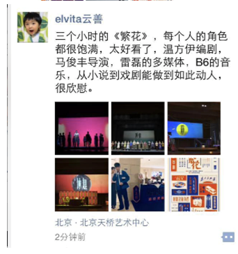 首演結束,觀眾在接受采訪時稱:“《繁花》非常超預期了!”“《繁花》一場,柔情似水。真得好看。”“我看到被雷擊一樣震撼。”“整個人三個小時里激動到頭皮發麻汗毛豎起哭了笑笑了哭……第一次所有人都離場了我還呆若木雞不想離開。千萬不要被方言攔在門外!抓緊!”“再次走進繁花的世界,有真意。”