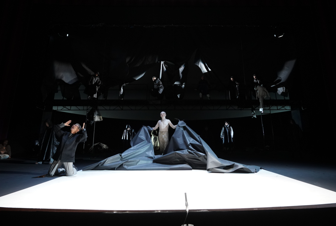豐富多元的舞臺呈現(xiàn)也成為當晚首演的精彩看點。延伸至觀眾席的圓形舞臺打破了演員與觀眾之間的“第四面墻”,浸入式的體驗讓現(xiàn)場觀眾不再是這場戲被動的旁觀者,而成為這場“暴風雨”的親身經(jīng)歷者,伴隨劇情的起伏波動而受到感染觸動。由音樂總監(jiān)巴里•甘伯格和音樂創(chuàng)作圖利古爾•剛子帶來的現(xiàn)場音樂伴奏更是給觀眾留下了深刻印象,二人利用非洲鼓、吉他、手指鋼琴以及我國傳統(tǒng)的呼麥、口技、現(xiàn)場演唱等多種表現(xiàn)形式,為《暴風雨》注入鮮活靈動的音樂生命力,將演出推向一個又一個高潮,“我們摒棄了音樂創(chuàng)作中的傳統(tǒng)形式,致力于為觀眾打造一種前所未有的聽覺體驗。我們用聲音和新穎的方式,以及具有異域風情或非傳統(tǒng)的演奏,喚起奇異的天籟之音,從而‘蠱惑’觀眾的想象力,將他們帶去遠方。”巴里•甘伯格說。為了更好的塑造劇中精靈們的形象特點,形體編導王亞彬還配合音樂專門設計了舞蹈肢體動作,無論是“張牙舞爪”的施展復仇計劃還是跳起熱鬧歡快的慶祝舞蹈,無所不在的精靈們皆成為國家大劇院版《暴風雨》最靈動活潑的存在,代表著荒蕪之中珍貴的夢想、自由和希望。