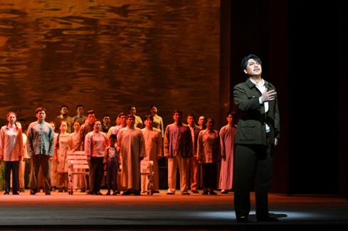 當晚的演出,飾演方志敏的男高音歌唱家韓蓬嗓音飽滿通透,在連續兩個小時不下臺的“馬拉松”式角色里帶來了酣暢淋漓的表現。從詠嘆調“這是一間囚室”中憤懣的控訴、“十送紅軍”中對鄉親和家人的依依不舍,“任何時候我們都不能選擇放棄”的剛毅斗志、“一場血戰”中對逝去戰友的哀痛,到最后在詠嘆調“假如我還能生存”噴薄而出的內心呼喊,韓蓬將方志敏革命戰斗的忠肝義膽與生活里的俠骨柔情都生動地展現在舞臺上,塑造出一個有血有肉的英雄男兒。飾演繆敏的女高音趙麗麗唱演俱佳,她與韓蓬“夫妻檔”的舞臺合作十分默契,二人的重唱“映山紅上杜鵑鳴”將全劇所闡釋的革命浪漫主義情懷推向一個高潮,催人淚下的旋律,成為了觸動觀眾內心深處的音弦。國家大劇院駐院歌劇演員劉嵩虎已是連續五輪在《方志敏》中飾演國民黨軍法處長胡翼,他深度融入角色,把胡翼的心理轉變、人性的回歸表現得頗具層次感,更加側面襯托出方志敏的高潔品格。