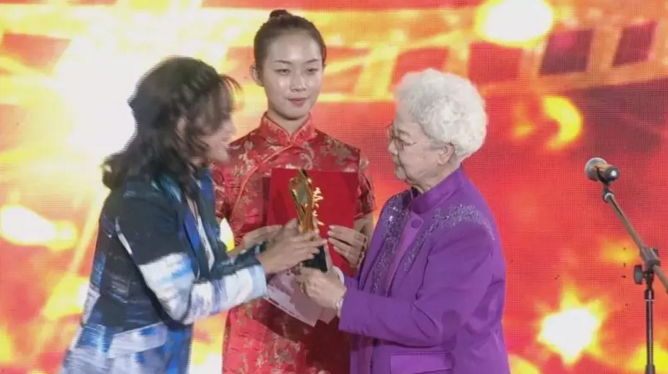 著名電影表演藝術家田華老師向劉曉慶頒發表彰證書與金玫瑰杯