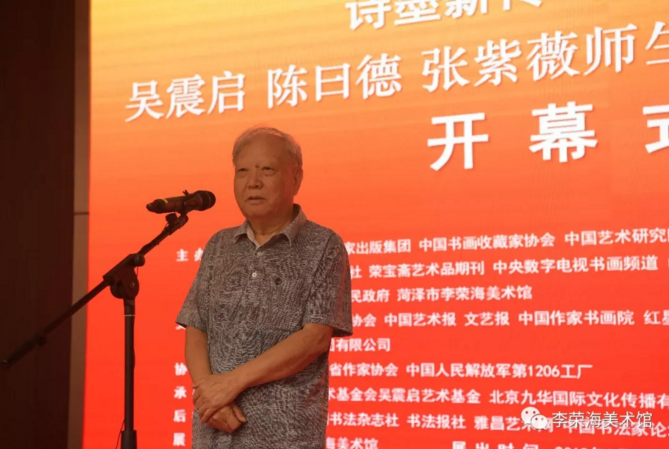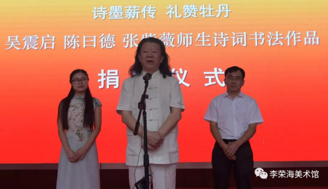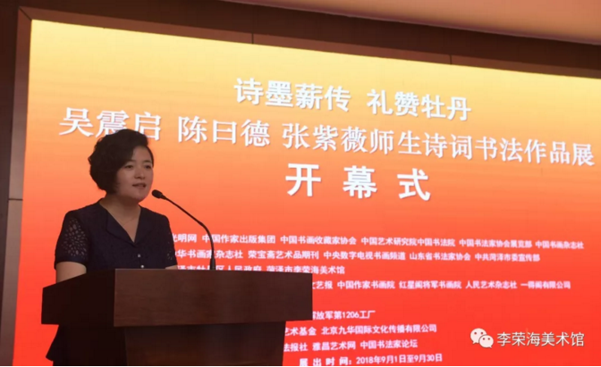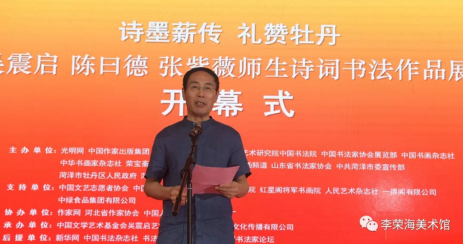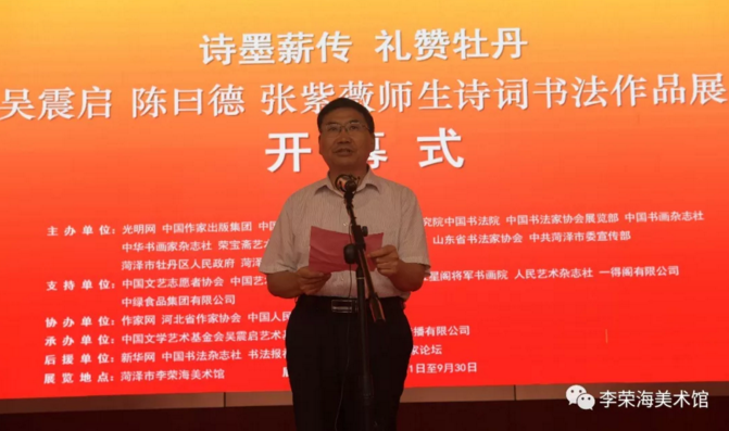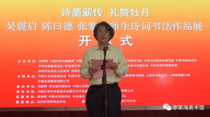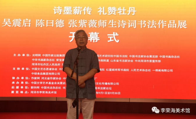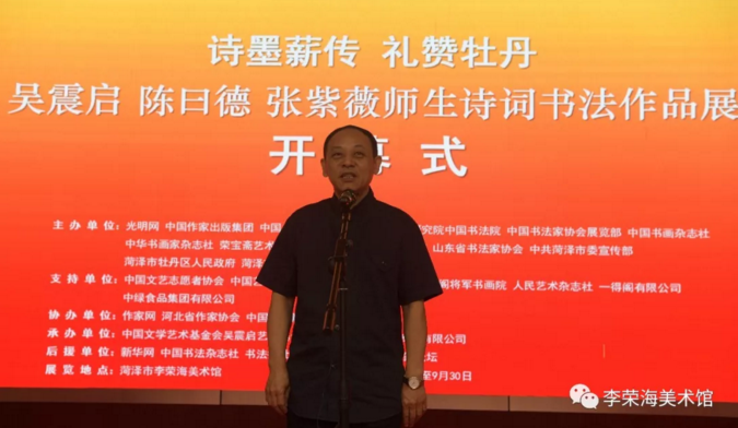 著名詩人、書法家吳震啟、陳曰德、張紫薇師生詩詞書法作品展,于2018年9月1日在中國牡丹之都——菏澤市李榮海美術館隆重開幕。