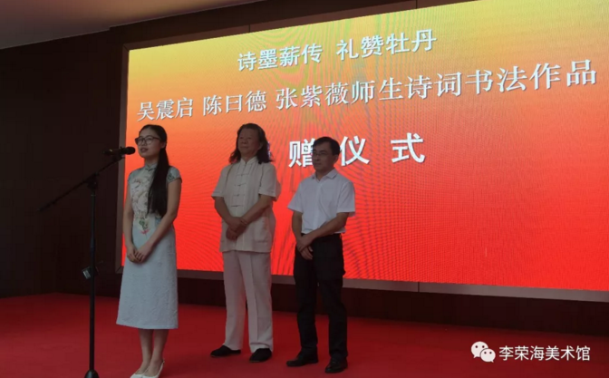 為繼承和發揚中華民族優秀傳統文化,弘揚中國詩詞和書法藝術,促進傳統詩詞與中國書法藝術融合,堅持從群眾中來,到群眾中去,為國家培養復合型藝術人才,為時代創作更多更好的文藝作品。應菏澤市李榮海美術館邀請,由李榮海、吳震啟、吳淑芬、張德冬、陳曰德、張紫薇共同策劃的“詩墨薪傳 禮贊牡丹”——吳震啟、陳曰德、張紫薇詩詞書法作品展及詠牡丹詩詞研討會、校園公開課等文化公益活動,在迎慶中秋、國慶雙節之際,于山東省菏澤市李榮海美術館隆重舉行。