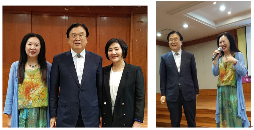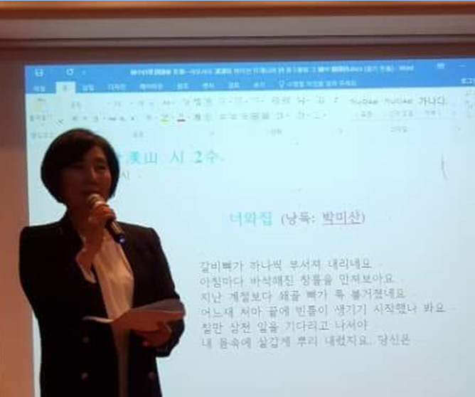 韓國詩人樸渼山2008年在《世界日報》新春文藝登上文壇,是文學博士,詩集有《淚囊的地圖》、《太陽之舌》等。2012年11月受中國人民大學邀請,作詩歌講座和詩朗誦表演。2015年同韓國和日本詩人們一起參加詩朗誦,并主持會議。現今為廣播大學、首爾數碼大學的客座教授。從2017年6月到現在,她運營詩歌網站“樸渼山的敞開心扉的詩”。 這次朗誦會,瀟瀟詩人朗誦了包括“低處的燦爛—致趵突泉”等五首自創的詩。還做了跨界舞蹈表演,非常優美,得到了大家的喝彩。樸渼山詩人朗誦了“木瓦房”等自創的五首詩。瀟瀟詩人的詩由主持本朗誦會的韓國外大樸宰雨教授和翻譯家裵桃任博士翻譯,樸渼山詩人的詩由哈爾濱工大威海校園的金鶴哲教授翻譯。此次朗誦會還邀請到朗誦藝術家崔大男老師朗誦了她們的幾首詩。另外幾首詩由檀國大學王樂教授和水原科學大學彭朝霞教授、明智大學李美玉博士以及幾位中文教育專業研究生參加朗誦,為第七屆韓中詩歌朗誦會增添了更多的色彩!讓這個秋天充滿了詩意的情趣……