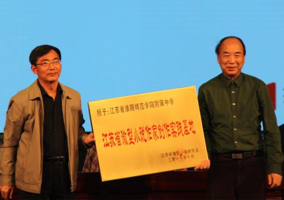 江蘇省微型小說研究會會長凌鼎年向淮陰師范學院附屬中學陳進才副校長授予“江蘇省微型小說作家創作實踐基地”銅牌。