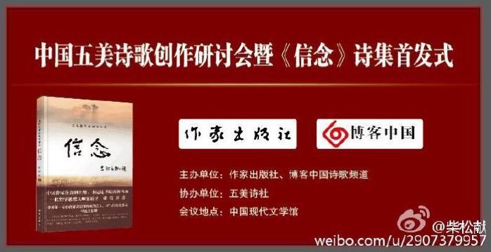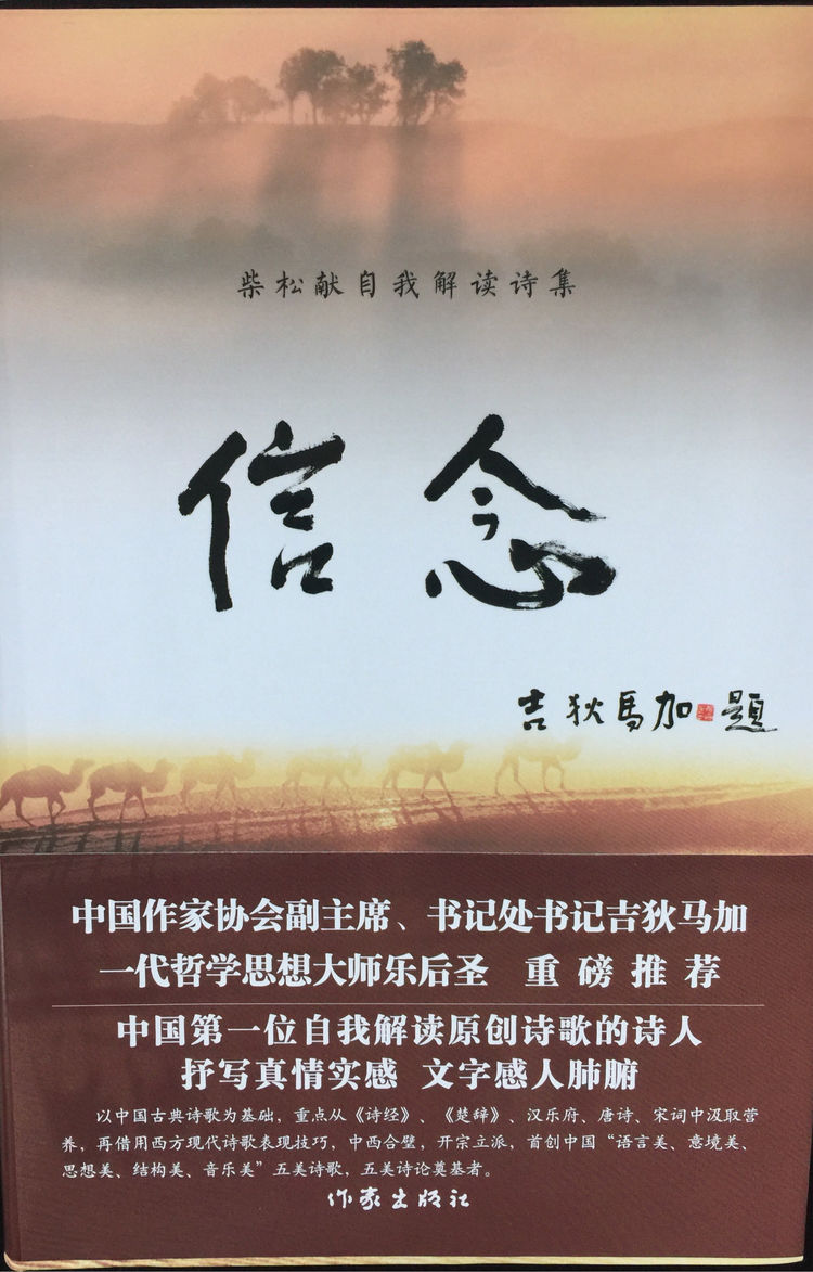 是的,柴松獻之所以取得詩歌上的成就,除了自身的不懈努力,還得益于這些詩歌大家的鼓勵與支持。他第一個特別感謝的是詩歌前輩賀敬之的來信激勵,才讓他毅然決然地走出中原,走進了北京新天地。第二個特別感謝著名詩人李瑛老前輩90年代在病床上的回信鼓勵,并于2013年為詩集《穿越靈魂》題寫書名。第三個特別感謝中國作家協會黨組成員、書記處書記張勝友的關心,才有了他的長篇批判小說《涅槃》的出版。他還特別感謝一代學者、著名哲學思想家、軍事戰略家、全球共同利益觀察家樂后圣的鼓勵,讓他在文學迷茫與放棄之際重新回歸,并有了詩集《宇宙之鷹》的出版。更感謝現任中國作家協會副主席、書記處書記、著名詩人吉狄馬加為新詩集《信念》題寫書名并作序,感謝中國詩歌學會的雷抒雁會長、張同吾會長、李小雨秘書長等詩壇大家的幫助,以及詩歌路上一直關注呵護激勵的諸如大衛、王世堯、寧新路、王彬、中島等各位摯友。