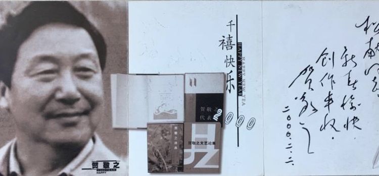 這是中國文聯特意為賀老定制的別具一格的千禧賀卡,上面印有他的頭像及其主要著作的封面。