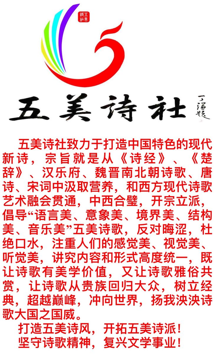 五美詩歌就是指“語言美、意象美、境界美、結構美、音樂美”,宗旨就是以中國古典詩歌為基礎,重點從《詩經》、《楚辭》、漢樂府、魏晉詩歌、南北朝民歌、唐詩、宋詞中汲取營養,再借用西方現代詩歌表現技巧,中西合璧,開宗立派,開拓一代詩風。我推出的五美詩歌,形式上糅合唐詩宋詞的優點,采取唐朝律詩起承轉合和宋詞長短句的格式,只不過律詩是8句,五美詩歌是16句,分4節,每節4行;每句不一定像律詩字數相等,而是像宋詞長短句一樣,更有節奏;韻律上講究押韻有規律,但也不一定一韻到底,既可以一節一節換韻,也可以兩行兩行的換韻,可以一二行、三四行分別押韻,一三行、二四行分別押韻,還可以一四行、二三行分別押韻,還可以一二四行押同一韻,更可以多種形式的韻律出現,押韻形式靈活多樣,富有變化……當然我推出的五美詩歌也不限每首16行,根據詩歌內容短詩也可以4行,6行,8行,長詩也可以50行,上百行,甚至數百行,只要語言、結構、押韻有規律可尋就行,講究章法,結構嚴謹,特別反對詩歌過于散文化!