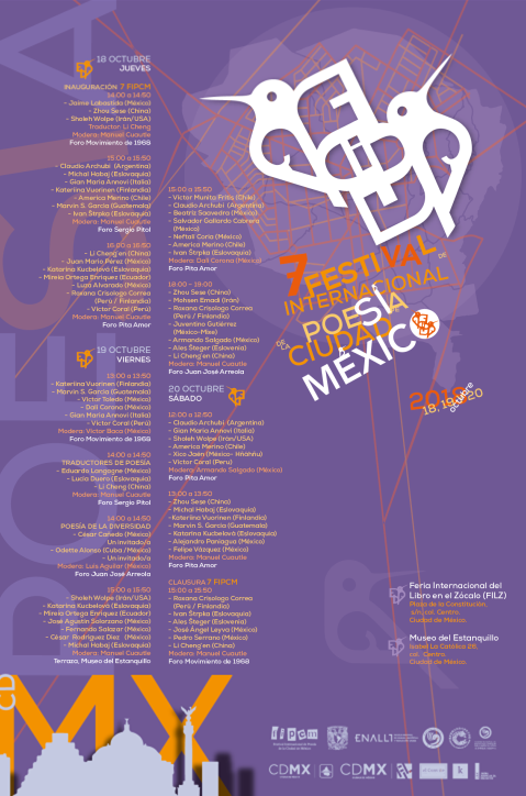 墨西哥城國際詩歌節已經舉辦了七屆,邀請世界各地的詩人參加詩歌朗誦與演講,由墨西哥城國際詩歌節組委會、墨西哥政府文化部與墨西哥國立自治大學孔子學院、孔院拉美中心聯合舉辦。本屆詩歌節邀請了中國、墨西哥、美國、意大利、西班牙、伊朗、秘魯、阿根廷、智利、斯洛伐克、厄瓜多爾、斯洛文尼亞、芬蘭、危地馬拉等國家的六十多位詩人參加。