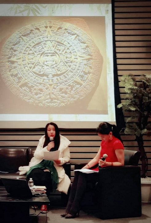 李成恩以“我的太陽石,向帕斯致敬”為主題與墨西哥詩人和觀眾交流,她介紹了她的創作歷程,從墨西哥詩人帕斯的《太陽石》講到故鄉的靈璧石,她說:“帕斯對于時間、神話、生命、死亡的寫作,在我最早寫作時對我形成了很好的啟示。我對《太陽石》通過‘聲音的回廊’走向環形的中心,走進陌生的世界,非常感興趣。我在寫作中注重‘聲音的回廊’的效果,從而達到一種現代詩的整體節奏。”