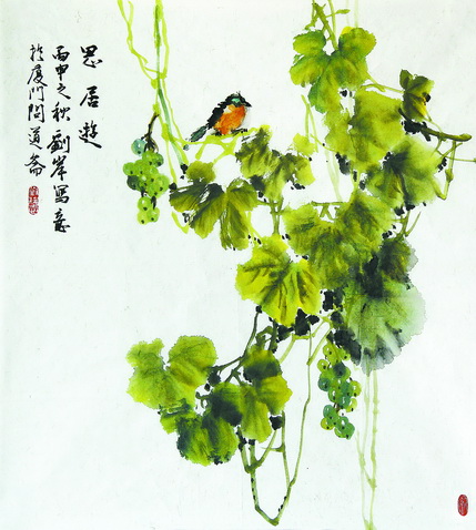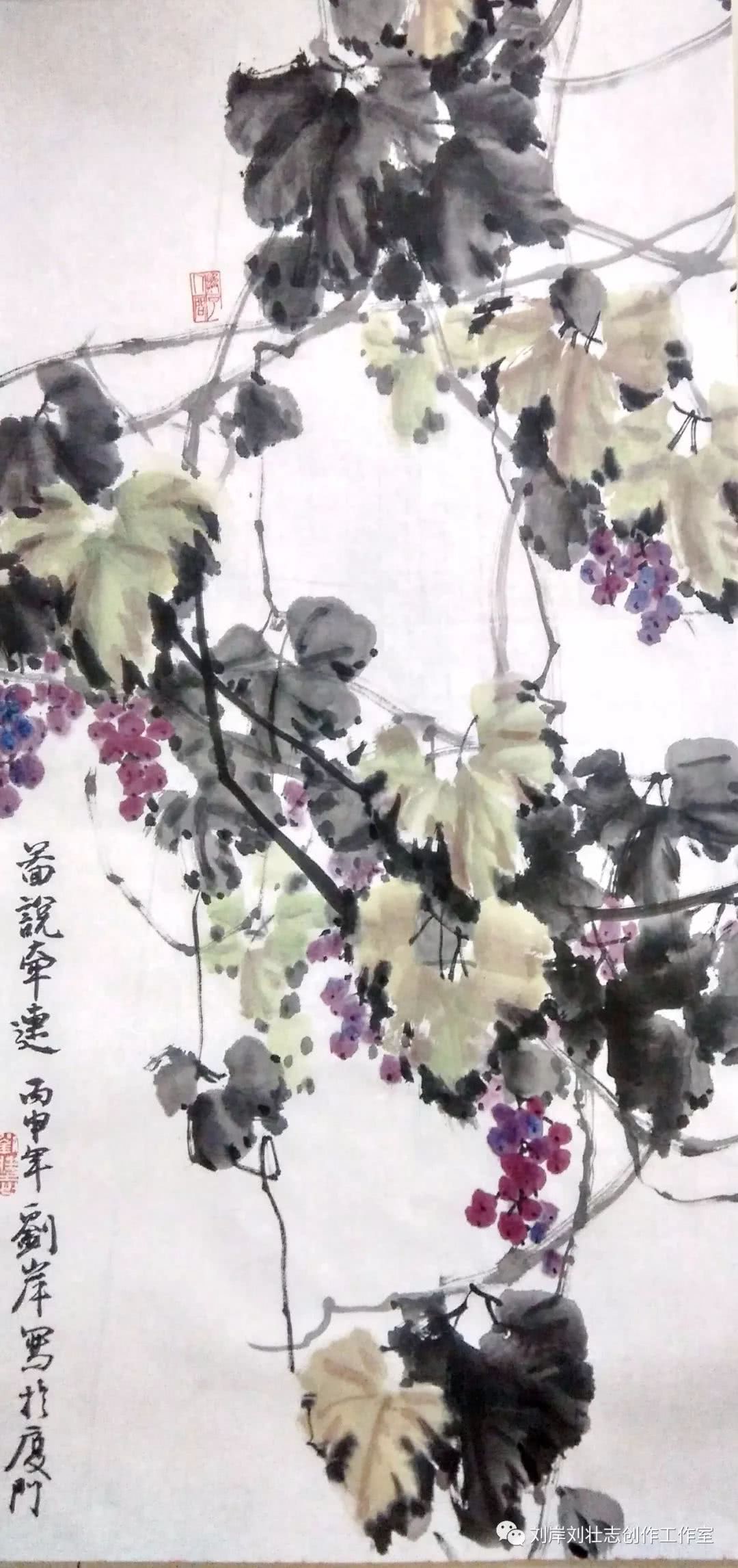 作家介入繪畫,對筆墨自然有與文字一樣的苛求,個(gè)性化和心靈化于是成了文人畫的特征。他的花鳥畫,一類是繼承傳統(tǒng)的梅蘭菊竹、四時(shí)花果菜蔬、鷹雀雁鴿等等;一類是寫生創(chuàng)新的葡萄、葵花等等。它們一旦被劉岸剪裁入畫,以書法用筆相應(yīng)施用,那一花一草、一鳥一蟲便有了獨(dú)特的意趣,感人的詩意。