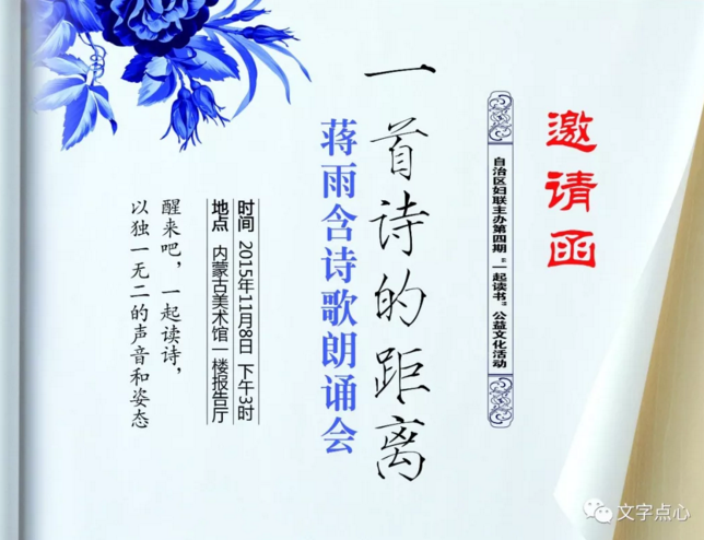 2015年11月8日,雨含專場詩歌朗誦會“一首詩的距離”在初冬的青城攪起了一股熱流。在那場詩歌朗誦會上,有一個頗為特殊的群體,這些人不僅僅是雨含的至交,他們還有一個共同的身份——草原氧吧博客圈的博友。這個博客圈是雨含在2006年創建的。群里有兩位重量級人物,一位是著名作家、內蒙古電視藝術家協會副主席杜拉爾·梅,一位是老作家、《實踐》雜志社原總編室主任孫甲先生。
