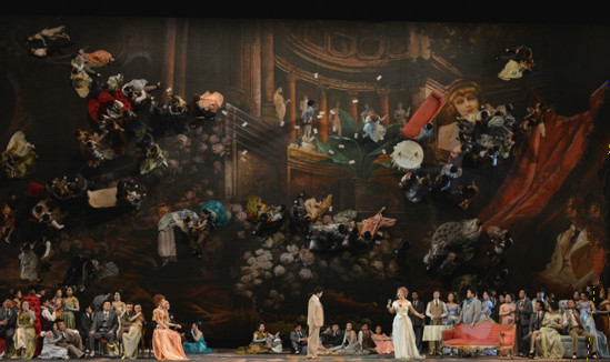 國家大劇院制作的這一版《茶花女》首演于2010年。該劇導演、燈光設計海寧•布洛克豪斯深入挖掘字面意思下人物行為的動機、心理狀態及矛盾,“添加了小仲馬和作曲家都沒有表達出來的東西”。在視覺呈現上,巨幅鏡面舞臺給觀眾留下了深刻的印象,不僅極富“詩意之美”,而且具有象征意義,在真實與“鏡像”間,映襯出“交際花”薇奧萊塔的愛情、生活與香消玉殞。此外,根據意大利著名畫家喬萬尼•博蒂尼的畫作設計的服裝,還原了19世紀巴黎的社會風貌,表現出那個時代的“時尚潮流”。
