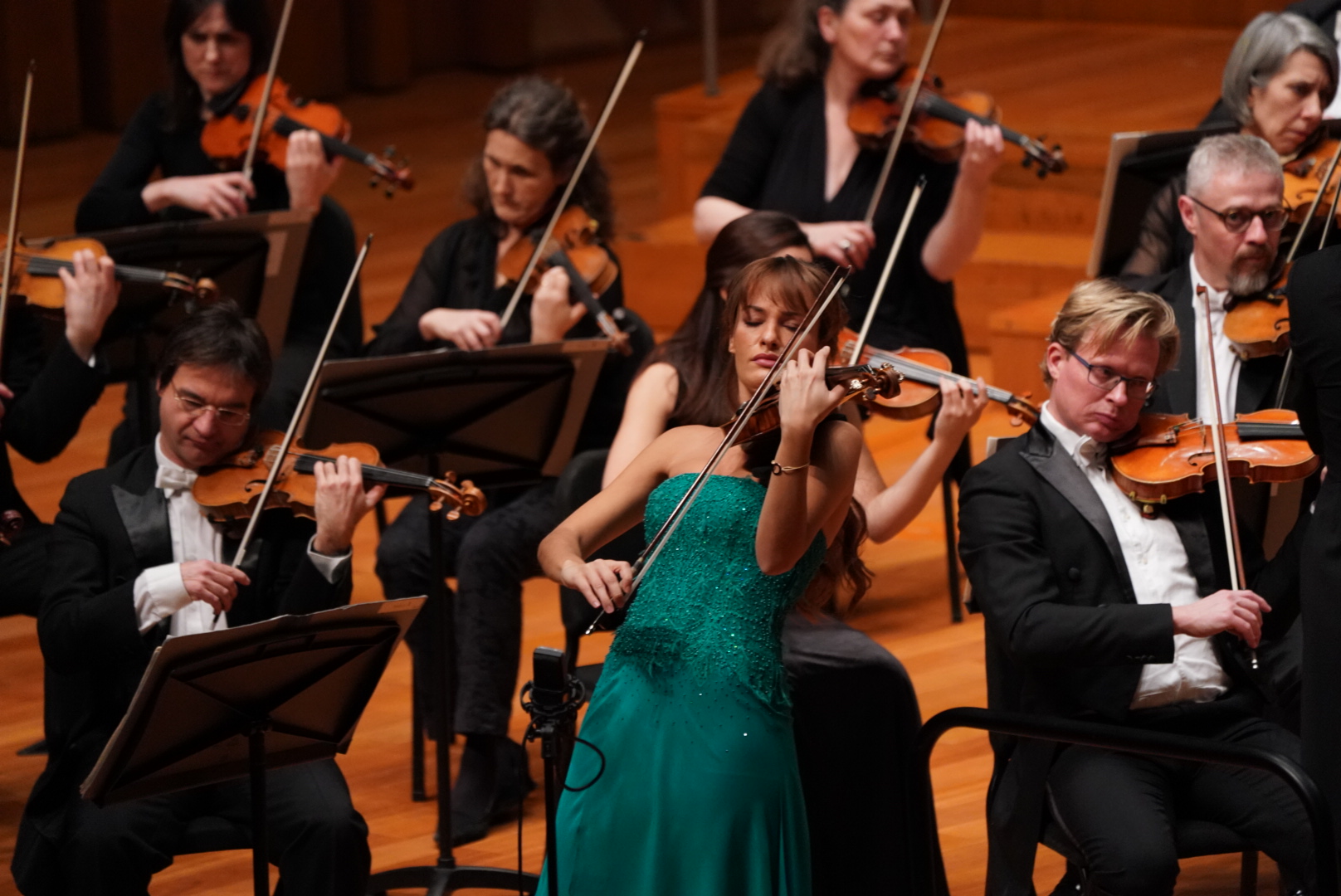 音樂會在德彪西的《蘇格蘭進行曲》中拉開了序幕。1891年,德彪西應利德將軍之約創作了這首具有蘇格蘭風格的進行曲,作曲家根據當地流行小調配以他新奇且富有色彩的和聲,生動地描繪了凱爾特人熱情淳樸的民族性格。當晚音樂會上,來自蘇格蘭的風笛手身著傳統民族服飾吹響了獨具特色的蘇格蘭風笛,粗獷不失細膩的音色瞬間將現場觀眾置身于大西洋東海岸的蘇格蘭高地,身臨其境般感知這片神秘島嶼的浪漫奇美。隨后,本尼黛蒂與樂團合作完成了布魯赫膾炙人口的小提琴名曲《G小調第一小提琴協奏曲》,從第一樂章獨奏小提琴大開大合的華彩樂句到第三樂章光輝熱情的炫技,本尼黛蒂精湛嫻熟的琴技令現場所有觀眾為之著迷。