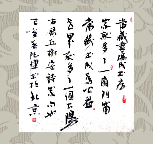丘樹宏的小詩構思巧妙,想象奇特,又蘊含了深摯的友情。更為錦上添花的是,詩人陸健揮毫潑墨,將詩句書寫于尺幅之上。這么一來,陸健那遒勁古拙的行書,好比是為這首美麗的小詩插上飛翔的翅膀。