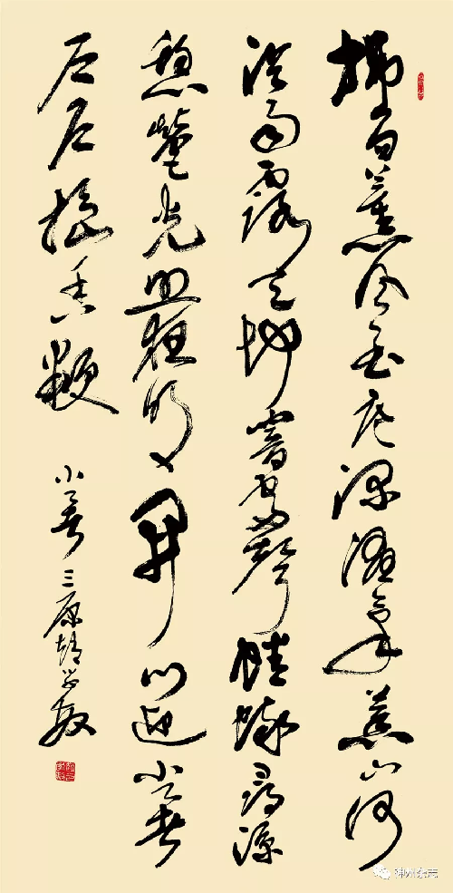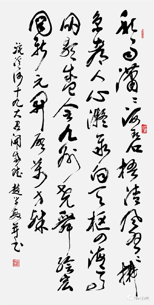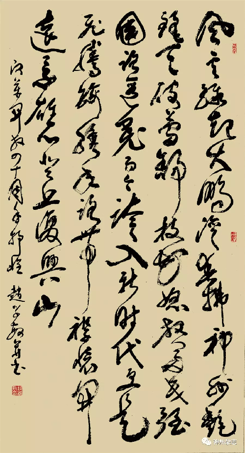 書法不只是為傳播而作的結(jié)體之貌和點(diǎn)畫之工,在書法家的眼中,它更是富有情感的生命體,能“達(dá)其情性,形其哀樂”?!拔艺J(rèn)為草書最能表達(dá)我的情感”,趙學(xué)敏基于深厚的碑文功底,吸收法帖精華,以高超的造詣勾勒的點(diǎn)線筆墨,不僅以靜態(tài)的形式展示著書法的美觀,更在出神入化和力透紙背的墨跡中,給人以變化多端的動(dòng)感,在宣紙上書寫著內(nèi)容和形式的和諧。他營(yíng)造出的高雅雋逸、正氣大象的意境,既符合我國(guó)傳統(tǒng)書法的審美標(biāo)準(zhǔn),又為時(shí)代潮流輸送著新鮮血液。他所書的《大美青?!纷鳛樾性屏魉牟輹髌?,就地取材,苦心經(jīng)營(yíng),用筆犀銳,瀟灑自然的揮墨中勾畫出線條外柔內(nèi)剛的韌勁,變化多端的筆勢(shì)中舒展出散而不亂、雅而不實(shí)的綿密情義,擒縱自如、豪放恣肆的筆墨中更流露的是他對(duì)青海的由衷贊譽(yù)。