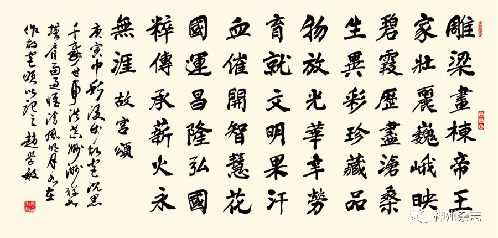 趙學(xué)敏的詩作與書法,除了凸顯扎實(shí)的文學(xué)與筆墨功底外,還是他在人生閱歷間捕捉的社會(huì)印記,有抒發(fā)山川景色的壯美,有對(duì)國(guó)家印象記憶的贊譽(yù),無論說古論今,文字里都飛躍著一種朝氣。作者讓自己創(chuàng)作的詩文綻放在書法中,實(shí)踐著書寫為人民的意愿,讓厚實(shí)的民族文化在大美中擴(kuò)散成為效應(yīng)。