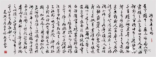 在兩岸文化交流中,趙學(xué)敏在臺(tái)北故宮博物院看到了于右任臨摹的孫過庭《書譜》,甚是喜愛。根據(jù)臺(tái)方饋贈(zèng)的拓片,他歷時(shí)三年反復(fù)研究《書譜》的味道,在深刻的頓悟中再現(xiàn)了這幅恢弘的書法作品,用墨彩飛動(dòng)的草書形式,意斷還連、頓挫縈回,細(xì)細(xì)勾勒出字里行間的豐潤(rùn)妍美,整體的謀篇布局法度嚴(yán)謹(jǐn),茂密樸厚之處亦有孫過庭的《書譜》三昧,處處洋溢著碑骨帖魂“威而不猛”的精神氣度,使他的小草達(dá)到了至真至純的精神境界,體現(xiàn)了書法創(chuàng)作的雅逸情趣。