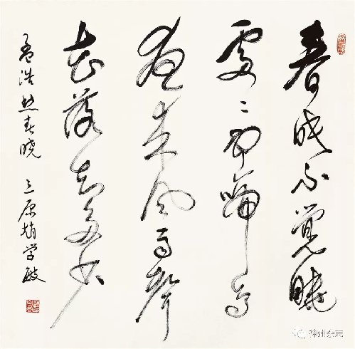 趙學(xué)敏的草書所涉內(nèi)容之多,在他的筆下,語言優(yōu)美的古文佳作多被墨香渲染,情系國(guó)家和人民的自作詩詞也在凝結(jié),然而無論哪種題材,趙學(xué)敏都在筆墨技法上下了很深的功夫。在孟浩然詩《春曉》作品中,他用筆老辣,在中鋒用筆和側(cè)鋒用筆的交織中,他極為注重運(yùn)筆的輕重緩急和水墨的虛實(shí)濃淡,字與字之間隨勢(shì)而安,行與行之間遞相映帶,共同呈現(xiàn)出了這樣“無心之處見匠心”的雄豪婉麗的書法作品。而“聞雞起舞功崇志,望夢(mèng)成真業(yè)廣勤”是他所創(chuàng)作的一幅草書七言聯(lián),聯(lián)句出自《尚書·周書》中的“功崇惟志,業(yè)廣惟勤”,兼具碑帖的骨力和趣味,清勁秀逸的筆勢(shì)中極富雄強(qiáng)氣息,烘托出社會(huì)主義的繁榮昌盛,從而弘揚(yáng)國(guó)家大道,彰顯社會(huì)新風(fēng)尚。