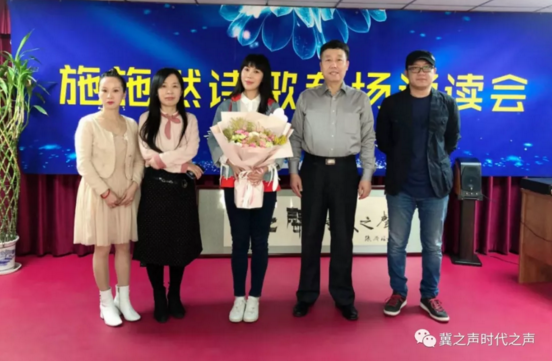 河北冀之聲朗誦藝術團郭金良團長首先介紹了施施然老師。施施然,本名袁詩萍,中國作家協會會員,河北文學院簽約作家,河北省女畫家學會副秘書長,近年以詩畫交相輝映的創作特點活躍于詩壇與畫界,詩作曾被翻譯為英語、瑞典語、法語、羅馬尼亞語、蒙古語、藏語、哈薩克語等語言傳播到海外,大量組詩發表于《中國作家》《人民文學》《詩刊》《鐘山》《山花》《文藝報》《天涯》《青年文學》《北京文學》《作品》《漢詩》等國內一線文學報刊選本,曾榮獲河北省委宣傳部頒發的河北文藝振興獎,中國作協重點作品扶持,《現代青年》雜志最受歡迎青年詩人獎,三月三詩歌獎,張堅詩歌獎主獎等多個獎項,已出版并發行詩畫集《走在民國的街道上》(臺灣)、詩集《唯有黑暗使靈魂溢出》、《青衣記》、《杮子樹》等,主編《中國女詩人詩選》,國畫作品多次入選國際國內畫展并被多方收藏。
