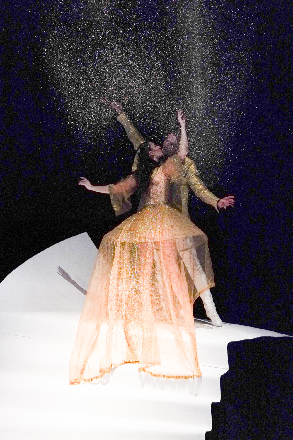首演現(xiàn)場(chǎng),由蒙特卡洛芭蕾舞團(tuán)明星舞者亞歷山德拉•托尼奧洛尼飾演的灰姑娘纖巧柔美、純真善良,她的美麗無需多余裝飾,綢緞質(zhì)感的連衣裙加上令人驚羨的足尖,她就是最完美的童話人物。灰姑娘逝母的化身——精靈,是劇中十分重要的角色,瑪麗安娜•巴拉巴以優(yōu)美舞姿、舒展肢體詮釋出了精靈親切、溫暖的形象。馬約版《灰姑娘》中的繼母和繼母的兩個(gè)女兒也不再是魯莽尖酸、丑陋愚笨的形象,由米莫扎•科伊克飾演的繼母和蓋爾•里烏、安娜•布萊克韋爾飾演的繼母女兒,以高抬腿、大跨步、扭臀擺胯的肢體動(dòng)作盡展婀娜多姿、風(fēng)情萬種的性感魅力。此外,由馬捷•烏爾班和弗朗切斯科•馬里奧蒂尼分別飾演的父親和王子,也以高難度技巧和動(dòng)人演繹將父親的躊躇不決和王子的忠貞不渝淋漓展現(xiàn)。