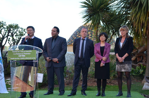 劉以林(左)在法國展開幕式上發言。同時參加開幕式的還有尼斯濱海自由城市長Christophe TROJANI先生(右三),副市長Pasquale HATTEMBERG女士(右一),駐馬賽領事館總領事余勁松女士(右二)。
