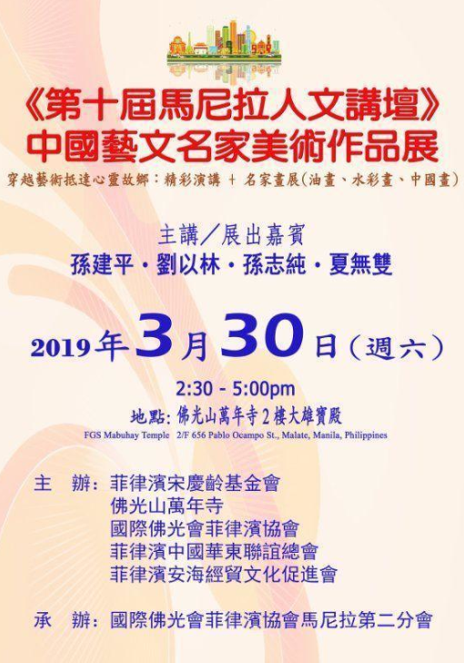 3月30日,由菲律賓宋慶齡基金會、佛光山萬年寺、國際佛光會菲律賓協會、菲律賓中國華東聯誼總會、菲律賓安海經貿文化促進會主辦,國際佛光會菲律賓協會馬尼拉第二分會承辦的《第十屆馬尼拉人文論壇》中國藝文名家美術作品展(以下簡稱“馬尼拉藝文名家美術展”)在菲律賓馬尼拉佛光山萬年寺盛大開幕。