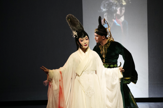 此次劇目采用插敘、倒敘等敘事手法,以出人意料的劇情與角色設置,全方位展現了王昭君的動人故事。開場便是送親隊伍行至胡漢交界,引得昭君感慨不已。隨后閃回至掖庭選秀,再穿越回家鄉楚地,通過隱隱薄紗巧妙變換,別具匠心。