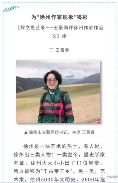 王景陶作為文學評論家,堅守本土、寄情本土、服務本土,40年來已評介230多位徐州作家,閱讀近萬篇(部)徐州作品,撰寫五百余篇計百萬字的文學評論。這種心無旁騖的執著堅持,源自他對家鄉徐州文學事業的摯愛。他2018年出版的《探文思藝錄一王景陶評徐州作家作品選》乃此類作品精粹之集大成。此書不僅具有促進徐州文學事業發展的藝術價值,還有紀錄徐州文學事業發展歷程的史料價值。2019年5月14日《都市晨報》全文刊登了市委宣傳部副部長、市文聯黨組書記兼主席王雪春為《探文思藝錄一王景陶評徐州作家作品選》所作序言《為“徐州作家現象”喝彩》,同時刊登了王景陶生平介紹。主流媒體如此力度的宣傳推介,代表了廣大讀者對王景陶的崇敬之情,傳遞了文宣主管部門對王景陶的褒獎之意,善莫大焉!雪春部長在文中稱王景陶是“徐州作家現象”的一個組成部分,讓我們來探尋他領受喝彩的理由。