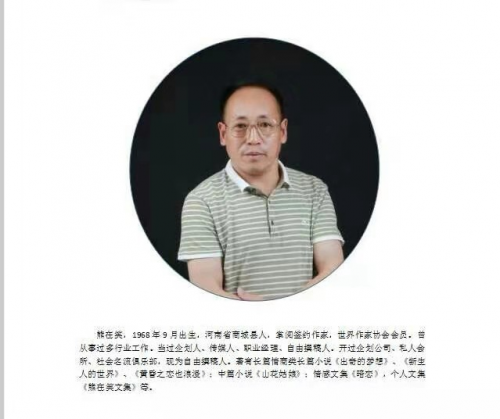 熊在笑,1968年9月出生,河南省商城縣人,信陽市作家協(xié)會會員、掌閱小說鑒約作家、河南報(bào)告文學(xué)學(xué)會會員、奔流文學(xué)院作家研修班學(xué)員。曾在鄭州從事過多行業(yè)工作。當(dāng)過企劃人、傳媒人、職業(yè)經(jīng)理人、自由撰稿人。開過企劃公司、私人會所、社會名流俱樂部,現(xiàn)在鄭州經(jīng)營熊在笑文化傳媒公司。著有長篇小說《出奇的夢想》《新生人的世界》《黃昏之戀也浪漫》;個人文集《蘭花姑娘的春天》,情感文集《愛情,誰是你永遠(yuǎn)的風(fēng)景》等,150余萬字。作品散見于報(bào)刊、雜志和網(wǎng)絡(luò)文學(xué)平臺。