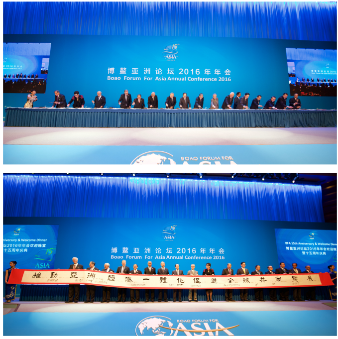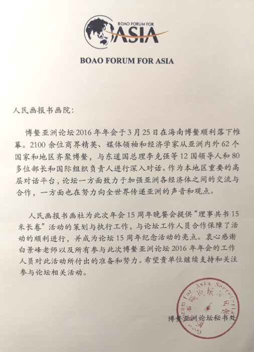 2016年3月23日,白景峰應博鰲亞洲論壇秘書處邀請,負責策劃“慶祝博鰲亞洲論壇成立15周年書法筆會”,日本前首相、博鰲亞洲論壇理事長福田康夫,中國國務院前副總理、博鰲亞洲論壇副理事長曾培炎,巴基斯坦前總理阿齊茲,馬來西亞前總理巴達維,法國前總理拉法蘭,新西蘭前總理希普利等17位博鰲亞洲論壇理事走上舞臺,拿起毛筆,在一幅15米書法長卷上,為“推動亞洲經濟一體化,促進全球共同發展”17個字各填一筆,然后簽名,加蓋中國龍紐印章,并共持15米書法長卷合影。此次書法筆會象征著各位理事要繼續努力,要為“推動亞洲經濟一體化,促進全球共同發展”事業再增添濃重的一筆。17位理事共持同一幅書法長卷合影,表達了“亞洲命運一體化”精神,在世界經濟下滑形勢下,亞洲各成員國只有團結一致,加強合作,才能克服面臨的共同困難,共同繪就亞洲經濟未來發展的完美畫卷。